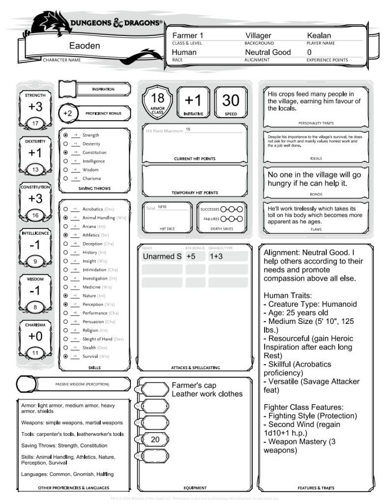 The story takes place in a remote village so I did not want the characters to be heroes, rather they are normal people going about their days that have their lives turned upside down. To accomplish this, I took existing D&D classes and made small changes to them to fit their role in the village and ended up with the following: