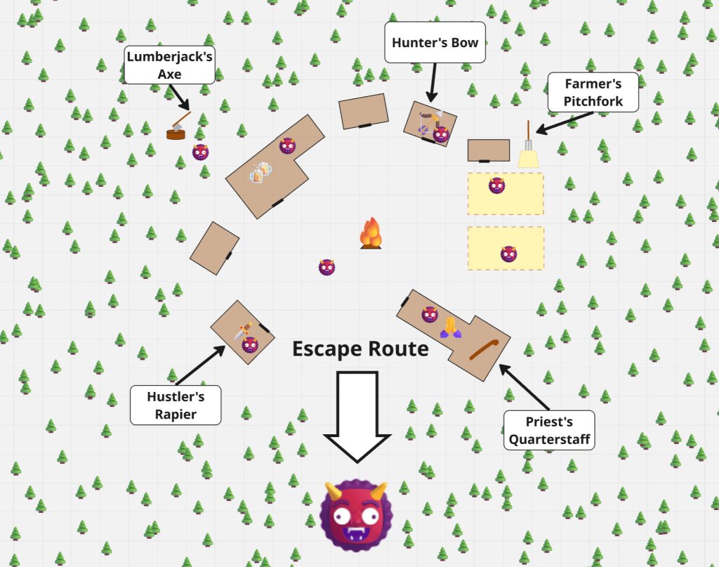 From here, players can decide amongst themselves whether they should try to acquire some or all of this gear or if they should just try to make a break for it. For some characters, being armed isn’t as important like for the Lumberjack who can use improvised weapons or the Priest who has a few basic cantrips to use while others like the Hunter become much deadlier upgrading to their weapon of choice but this is ultimately for players to decide.
