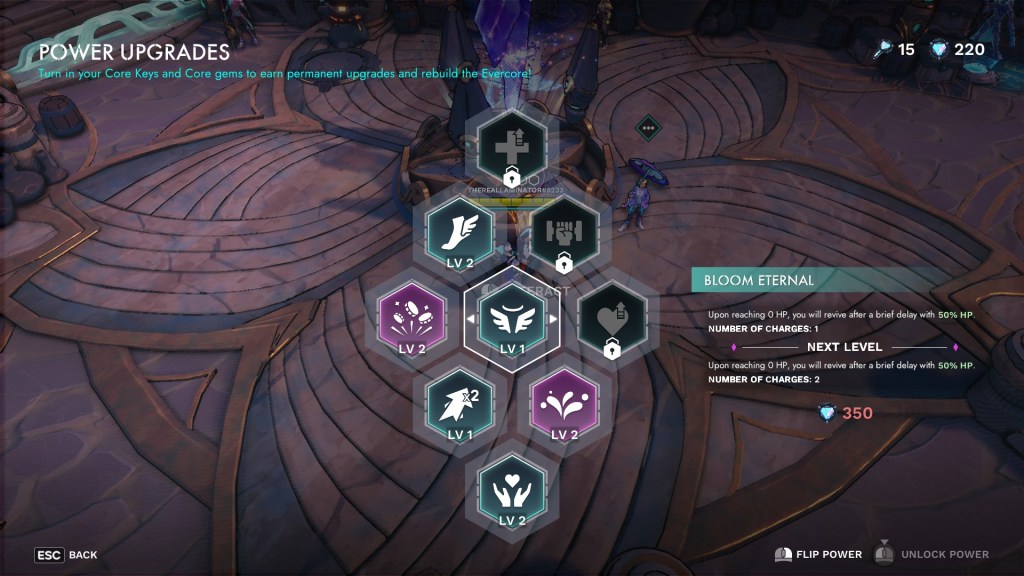 - Soulbound Blooms: Character specific upgrades that usually amplify individual ability effects, grant max HP or Luum (Evercore’s version of Mana) or alter the behaviour of a character’s dash by granting more travel distance or reducing the cooldown.